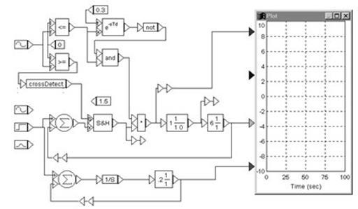В верхней части модели собрана вспомогательная схема, формирующая очень короткие импульсы, которые с выхода блока CrossDetect подаются на схему Semple-Holde (S&H – слежение – запоминание), и импульсы длительностью t, которые подаются на импульсный модулятор. Длительность этих импульсов равна времени задержки блока задержки. Для сравнения процессов в импульсной и непрерывной системах собрана модель непрерывной системы с одним интегратором.