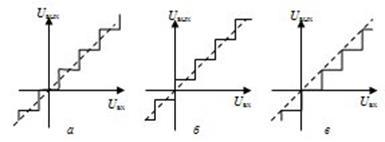Преобразование непрерывной величины в квантованную с наименьшей ошибкой осуществляется в устройствах квантования с двумя типами характеристик. Первая характеристика (рис. 10,а) имеет в окрестности нуля зону нечувствительности, а вторая (рис. 10,б) – релейную характеристику. Для обеих характеристик отклонение квантуемого процесса от квантованного не превышает половины шага квантования h. Характеристика стандартного АЦП приведена на рис. 10,в. Для нее максимальное отклонение входного и выходного процессов равно шагу квантования. Стандартный АЦП описывается уравнением: V = hE{U/h}. Здесь Е{a} означает целую часть числа a. Причем под целой частью следует понимать ближайшее целое число, меньшее a. Например, Е{0,2} = 0, а Е{-0,2} = -1. Заметим, что для формирования характеристики рис. 10,а нужно к входному процессу стандартного АЦП добавить h/2, а для формирования характеристики рис. 10,б – добавить h/2 к выходному процессу.