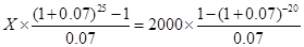 Предприниматель после выхода на пенсию намеревается обеспечить себе приемлемые условия проживания в течение 20 лет. Для этого ему необходимо иметь в эти годы ежегодный доход в сумме 2000 долл. До момента выхода на пенсию осталось 25 лет. Какую сумму должен ежегодно вносить в банк предприниматель, чтобы данный план осуществился, если приемлемая норма прибыли равна 7%. Схема постнумерандо.