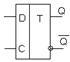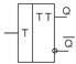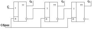 Как следует из таблицы 5.1 самый младший разряд Q0 меняет свое состояние с каждым счетным импульсом, смена состояния каждого последующего разряда происходит, если предыдущий переходит из единичного в нулевое состояние. Если использовать Т-триггеры, соединенные так, как показано на рисунке 5.1, то получим именно такую последовательность смены состояний триггеров.