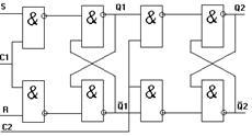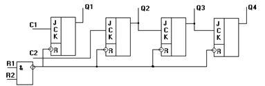 Например, для получения Ксч=10 сначала определяют количество триггеров. Их должно быть четыре, т.к. 24=16, что больше, чем 10. Производят соединение Q1 с С2. Затем записывают в двоичной форме десятичное число десять: это будет Q1=0, Q2=1, Q3=0, Q4=1. При Ксч=1010 максимальный выходной код соответствует числу 910, а следующее за ним число – 010, а не 1010. Следовательно, соединив выходы Q2 и Q4, на которых единицы одновременно появляются после десятого импульса, со входами R1 и R2, получим обнуление счетчика десятым импульсом, что и будет соответствовать Ксч=1010. На рисунке 5.11 показан счетчик с Ксч=10, построенный по описанной методике.