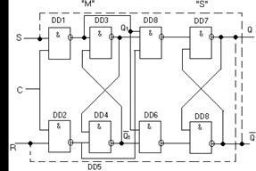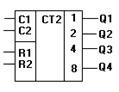 Счетчик К155ИЕ5 состоит из четырех счетных триггеров на основе JK-триггеров, причем он содержит две независимые части с Ксч=2 (вход С1 и выход Q1) и с Ксч=8 (вход С2 и выходы Q2, Q3, Q4). С помощью внешних соединений Q1 с С2 можно получить последовательный счетчик с Ксч=2×8=16. Входы R1 и R2 служат для сброса (обнуления) счетчика, которое произойдет, если R1 = R2 = 1.