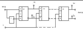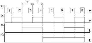 Каскадное включение п таких триггеров образует счетчик с коэффициентом счета Ксч = 2n. При этом необходимо помнить, что каждый триггер обладает Ксч = 2, а при их последовательном соединении коэффициенты счета перемножаются. На рисунке .2 видно, что период следования импульсов после каждого триггера увеличивается вдвое, и после последнего превышает период входных импульсов в Ксч раз. Соответственно частота уменьшается в такое же количество раз, т.е. делится на число, равное Ксч. Это свойство положено в основу использования счетчиков в качестве делителя частоты.