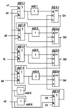 Здесь счетные импульсы одновременно поступают на входы синхронизации Т всех триггеров, а на разрешающие входы V подаются сигналы, определяющие конкретные триггеры, которые изменяют свое состояние при данном входном импульсе. Если V=1, то триггер работает как обычно, если V=0, то находится в режиме хранения. Принцип работы счетчика следует из таблицы .1: триггер меняет свое состояние при поступлении очередного импульса синхронизации, если все предыдущие триггеры находились в состоянии логической единицы.
