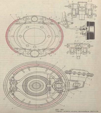 с равными приводными силами и односторонним расположением опор колодок. Опорный диск 3 закреплен на картере моста. В нижней части опорного диска установлены два пальца 13, на которых закреплены эксцентричные шайбы 12. Положение пальцев фиксируют гайками 14. На эксцентричные шайбы надеты нижние концы колодок 1 и 5. Стяжная пружина 4 прижимает каждую колодку к ее регулировочному эксцентрику 11. Регулировочные эксцентрики закреплены на опорном диске болтами 9, удерживаемыми от произвольного проворачивания предварительно сжатыми пружинами 10. Пружина фиксирует регулировочный эксцентрик в любом положении при повороте его за головку болтов. Таким образом, каждая колодка центрируется относительно тормозного барабана регулировочными эксцентриками и эксцентричными шайбами пальцев. Верхние концы колодок соприкасаются с поршнями цилиндра 2. От боковых смещений колодки удерживаются направляющими скобами 7 с пластинчатыми пружинами. Длина фрикционных накладок, прикрепленных к передним и задним колодкам, неодинакова. Передняя накладка 8 длиннее задней 6. Сделано это для обеспечения одинакового износа накладок, так как передняя колодка работает большее время как первичная и создает больший тормозной момент, чем задняя. Барабан тормоза прикреплен к ступице колеса. Для удобства доступа к колодкам барабан сделан съемным.Тормоз автомобиля