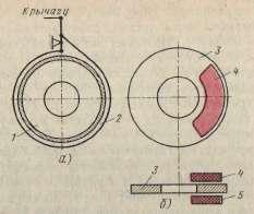 состоит из вращающегося диска (рис., б) и двух не вращающихся колодок 4 и 5, установленных с обеих сторон диска. При торможении колодки прижимаются к диску, создавая тормозной момент. Эффективность дисковых тормозов ниже, чем барабанных (при одинаковых радиусах приложения приводных сил), а стабильность высокая. Силы трения нагружают опоры диска, т. е. тормозной механизм неуравновешен.