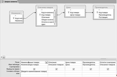 Добавил необходимые таблицы, выбрал нужные поля в них, в столбце Наименование товара ввел условие отбора [Введите наименование товара].