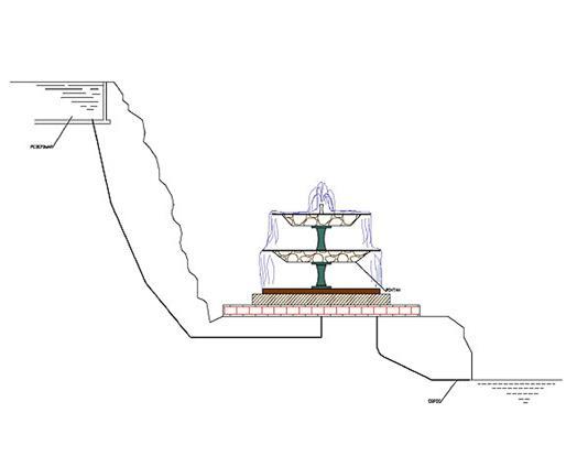 1. При наличии двух водоемов (водотоков) имеющих значительную геодезическую разность высот и связанных между собой водотоком, образующих единую экосистему. В данном случае вода из верхнего водоема, прежде чем попасть в нижний, осуществляет питание фонтана (Рис.5).