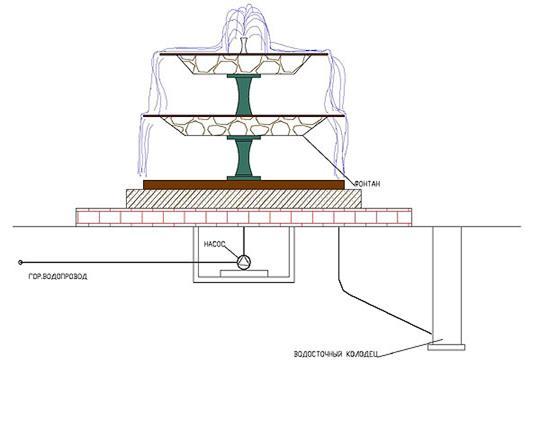 – с помощью насоса из водоема, в котором расположен фонтан, со сбросом воды в него же;