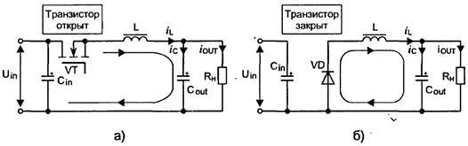 , когда ключевой элемент VT открыт, то есть проводит ток (рис. 3, а). Этот ток далее проходит через дроссель L к нагрузке, шунтированной конденсатором Сout. Накопление энергии происходит как в дросселе, так и в конденсаторе. Ток iL