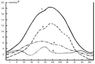 Закономерные изменения продолжительности светлой части суток и полуденной высоты Солнца определяют суточный и годовой ход (режим) солнечной радиации. (Рис.1.1.)