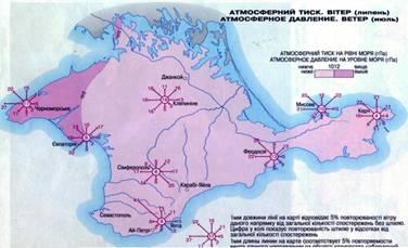На территории Крыма в среднем за год атмосферное давление у поверхности земли характеризуется следующими показателями: в прибрежных пунктах и в центральных степных районах – 760-763 мм, в предгорье на высоте около 300 м над уровнем моря – 735-740 мм, на вершинах Крымских гор на высоте 1000-1500 м – 635-615 мм.