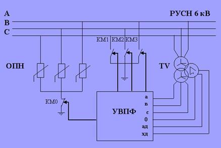 При возникновении любого вида однофазного замыкания на землю с помощью устройства выбора поврежденной фазы (УВПФ) происходит автоматическое включение соответствующего шунтирующего однофазного выключателя (КМ1-КМ3), соединенного с землей, и тем самым шунтирующего поврежденную фазу. Устройство выбора поврежденной фазы срабатывает с выдержкой времени порядка 0,5 с, отстроенной от времени действия защит на отходящих присоединениях. Пусковой орган УВПФ срабатывает при условии возникновения на трансформаторе TV напряжения 3Uо, превышающего заданную уставку, и при снижении одного из фазных напряжений до заданного уровня подает команду на включение соответствующего шунтирующего выключателя (КМ1-КМ3).