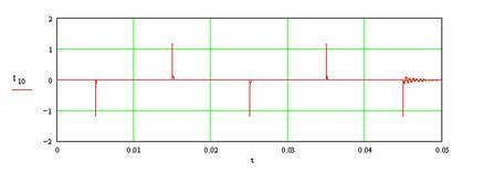 Рисунок 4 – Замыкание фазы С на землю и погасание дуги при первом переходе через «нуль» тока высокочастотных колебаний (RD=100 Ом, С =3 мкФ, IC= 9 А)
