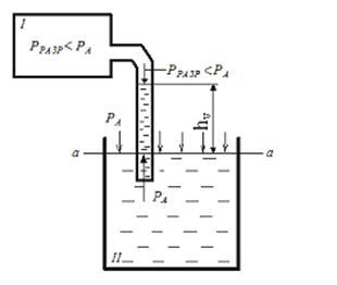 Рассмотрим два сосуда I и II (риc. 4), соединённые между собой. Сосуд II заполнен жидкостью и имеет давление на свободной поверхности, равное атмосферному P