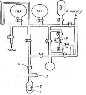Часто статический метод используют для измерения скоростей реакций, приводящих к изменению числа молекул, что позволяет следить за ходом реакции по изменению давления. На рис. 1 дана установка для изучения скорости реакции водорода с кислородом статическим методом. Перед опытом в ней устанавливают вакуум 10-5