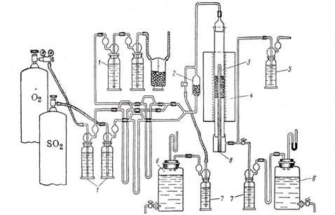 Газовую смесь через смеситель 2 направляют в реактор 3 с контактной массой. Контактная трубка помещена в электрическую печь 4, снабженную тремя самостоятельно регулируемыми нихромовыми спиралями. Это дает возможность регулировать температуру отдельно в разных частях слоя контактной массы с достаточным приближением к изотермичности. Колебания температуры по слою не должны превышать 5°С. Концентрацию сернистого ангидрида определяют до контактной трубки и после нее.