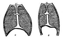 Форма грудной клетки при вдохе (а) и выдохе (б).