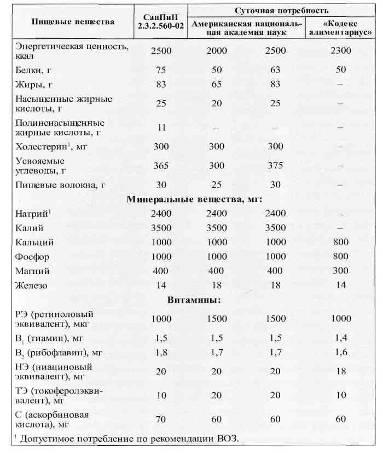 Таблица 1 Варианты суточной потребности человека в пищевых веществах и энергии