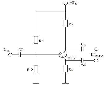 Для согласования с нагрузкой на выход широкополосного усилителя необходимо поставить усилитель, который не должен вносить изменения в амплитуду сигнала, должен обладать высоким входным и низким выходным сопротивлением. Всем этим требованиям удовлетворяет усилительный каскад на биполярном транзисторе, включённом по схеме с общим коллектором (эмиттерный повторитель).