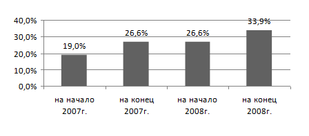 Согласно таблице 11 и рисунку 7 величина рентабельности собственного капитала возросла на 36 процентных пунктов относительно показателя на конец 2008 года. Такой скачок обусловлен увеличением коэффициента оборачиваемости активов, возросшего в 1,7 раз. Причиной же увеличения коэффициента оборачиваемости активов стало проведение операции факторинга и последующее введение кредитной политики, предложенной в главе 2.