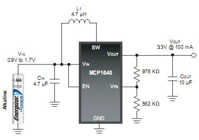 Повышающий переключатель на MCP1650 использует внешнее переключение таким образом, что он может быть использован для любого типа нагрузки. Дополнительное преимущество MCP1650 в батарейных применениях - это Gated Oscillator Architecture, которая обеспечивает два рабочих цикла, что уменьшает пиковой ток индуктора и пульсации выходного напряжения. Входное напряжение выше 3, 8В занимает 56% рабочего цикла и 80% когда входное напряжение падает ниже 3, 8В. Это увеличивает срок службы батареи.