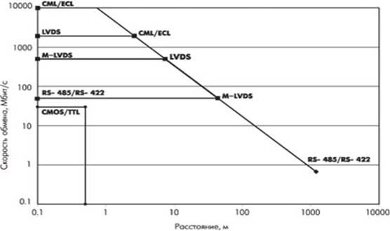 При расстояниях до 30 м и скоростях передачи менее 50 Мбит/с обычно используют интерфейсы стандартов TIA/EIA-422 (RS-422, multidrop) и TIA/EIA-485 (RS-485, multipoint). Выходные дифференциальные сигналы высокого уровня, чувствительные приемники и работоспособность при уровнях помех до 7 В - их положительные качества для обеспечения эффективного обмена данными между удаленным оборудованием. Для скоростей передачи более 50 Мбит/с или в устройствах, где очень важно низкое потребление энергии, применяют интерфейсы LVDS или M-LVDS. Передача и прием со скоростью около 10 Гбит/с обеспечивается эмиттерно-связанной логикой (ECL - emitter-coupled logic) или положительной эмиттерно-связанной логикой (PECL - positive ECL). Однако такая высокая скорость обмена достигается за счет увеличения стоимости при сильном росте потребляемой мощности.