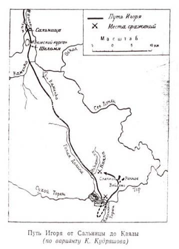 В походе у берегов Донца 1 мая, когда день клонился к вечеру. Их застигло затмение, на Руси считавшееся предзнаменованием несчастья. Но Игорь не поворотил коней. Он сказал своим боярам и дружине: "Братья и дружино! Тайны божия никто не весть, а затмению творець бог и всему миру своему. А нам что створить бог, - или на добро, или на зло, - а то же нам видити." Сказав тат Игорь переправился через Донец. У Оскола Игорь два дня поджидал своего брата Всеволода, шедшегоиным путем от Курска. От Оскола пошли дальше, к реке Сальнице.