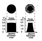 Идеальная растровая точка на диапозитиве или негативе должна иметь четкую границу между прозрачным и черным полями. Профиль такой точки имеет форму прямоугольника (рис. 5). Однако такие растровые точки получить тяжело.