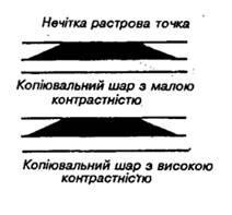 При высокой контрастности копировального слоя применение нечеткой растровой точки на диапозитиве или негативе дает возможность получить значительно более чёткую точку на копии, чем при применении копировального слоя с малой контрастностью.