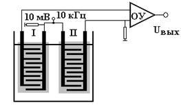 Рисунок 3. Схема измерения проводимости тонкопленочного биосенсора, где I - рабочий электрод, II - электрод сравнения.