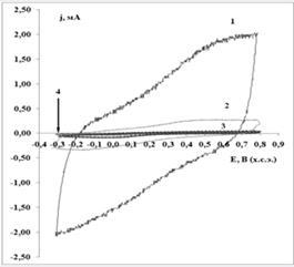 40 мин. и потом в растворе пираньи; 4 – чистая Pt обработанная в царской водке 10 мин., затем в растворе пираньи; 3 – Pt/ 2 наномолекулярных слоев ІМ АСКМ/ PBS; 2 – чистая Pt обработанная в царской водке, в растворе конц. HNO3