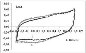 На рисунке 15 представлено такое сравнение при одинаковых экспериментальных условиях и при одинаковой скорости развертки по потенциалу при пересчете ЦВАЗ на единичную площадь Аu-электродов. Полученные кривые практически совпадают. На большом пластинчатом электроде Au более выразительно выражен токовый максимум.