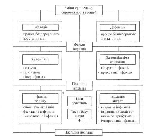Інфляція - процес знецінення грошей унаслідок надмірної емісії та переповнення каналів обігу і масою. Зовні вона проявляється у зростанні загального рівня цін та зниженні купівельної спроможності грошей. Перебіг інфляційного процесу схематично ілюструє рис.1.1.
