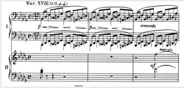При варьировании возникают такие варианты темы, которые сами становятся темами для будущего варьирования, например XIV и XV вариации, XVIII – лирическая кульминация всего цикла – является вариацией на XIV и, одновременно, явно производна от главной темы (обращение). Тема Паганини очень быстро становится темой Рахманинова, то есть, поглощается, ассимилируется авторским стилем. Даже "скрипичные" приемы игры на фортепиано не обманут слушателя – гармония и фактура в целом остаются рахманиновские (пример 1).