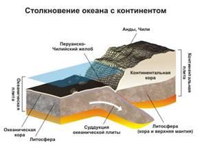В глубоководных желобах плиты литосферы погружаются, образуя сдвиги по фокальным зонам. При этом в области островных дуг и желобов происходят накопление мощных толщ осадков, их смятие и тектоническое перемешивание, а по мере погружения океанических плит в область высоких температур и давлений— их переплавление и дифференциация с образованием андезитовых магм. Вместе со смятыми осадочными толщами магматические андезитовые тела и покровы образуют «гранитный слой» земной коры, а отщепленные базальтовые магмы наращивают снизу «базальтовый слой» материковой коры.