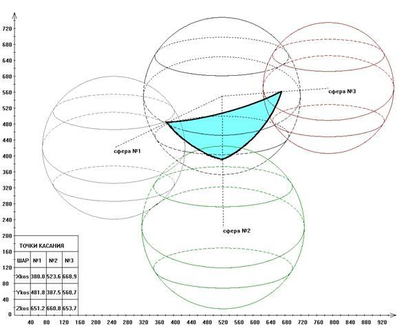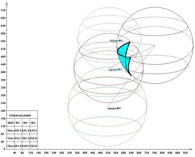 3. Вычисляютя координаты точек касания большого атома с 3-мя остальными.