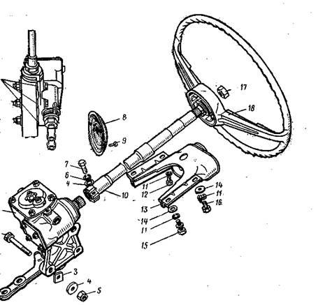 Картер рульового механізму (див. рисунок 2) 1 прикріплений до лівої подовжньої балки кузова з внутрішньої сторони відсіку двигуна трьома болта-м-и 2. Між картером і балкою кузови встановлюються регулювальні шайби 3, підбором яких домагаються співвісності вала черв'яка кермового механізму і вала рульового керування. В картері 7 кермового механізму мається черв'як 6, що входить у зачеплення з двухгребневим роликом 14 вала сошки. Передаточне число кермового механізму — 16,4. Черв'як напресований на вал 15 і обертається в двох кулькових підшипниках, причому внутрішніми обоймами підшипників є торцеві поверхні черв'яка, на яких маються кільцеві канавки. Осьовий зазор у підшипниках черв'яка регулюється підбором прокладок 18 між картером і кришкою 19 кермового механізму. Ці прокладки поставляються в запасні частини двох розмірів: товщиною 0,1 і 0,15 мм. Вал сошки обертається в двох бронзових втулках 12, запресованих у картер кермового механізму. У шлицевом отворі сошки маються дві здвоєні западини,