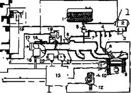 1-паливний бак; 2-паливний насос; 3-фільтр тонкої очищення палива; 4-розподільна лінія; 5-регулятор тиску палива в системі; 6-пускова унка; 7-підведення розрідження до регулятора тиску палива в системі; 8-форсунка упорскування; 9-блок циліндрів двигуна; 10-датчик температури охолоджувальної рідини; 11-термореле; 12-датчик-розподільник запалювання; 13-електричний блок керування; 14-блок реле; 15-вимикач запалювання; 16-витратомір повітря; 17-підведення повітря; 18-гвинт регулювання якості суміші на неодруженому ходу; 19-клапан додаткового повітря; 20-гвинт регулювання якості на холостому ходу; 21-вимикач положення дросельної заслінки; 22-висотний коректор.