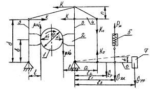 Рис. 1. Расчётная схема двухколодочного тормоза: 1 – тормозной шив, 2 – тормозные колодки, 3 – вертикальные рычаги, 4 – треугольник; 5 – электромагнит; 6 – горизонтальный рычаг; 7 – затормаживающий груз.