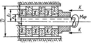 В дисковых тормозах (рис. 4) ряд дисков I фиксируется со скольжением на шпонках в неподвижном корпусе, а второй ряд дисков II получает такую же связь с тормозным валом. При сжатии обеих групп дисков силой К между ними возникает сила трения, создающая тормозной момент.