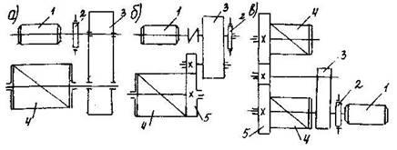 а – «П» - образная; б - "Z"-образная; в - соосная. 1 – барабан; 2 – электродвигатель; 3 – тормоз; 4 - редуктор.