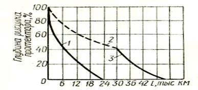 1 – эксплуатация шины на ведущих колесах без обкатки; 2 – обкатка на передних колесах; 3 – дальнейшая эксплуатация шин на ведущих колесах после обкатки