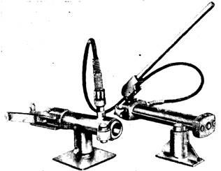 Одной из наиболее трудных операций при монтаже и демонтаже шины с ободом типа «трилекс» бездисковых колес тяжелых грузовых автомобилей и автобусов особо большой вместимости по праву считается установка и снятие сегментов обода, выполнение которой при помощи ручных монтажных лопаток занимает много времени. Для механизации этой операции применяется приспособление (рисунок 11), представляющее собой гидравлический цилиндр со сменными наконечниками. Этот цилиндр устанавливают внутрь обода колеса и подают в него под высоким давлением жидкость. В зависимости от операции (разборка или сборка) соответствующие наконечники, упираясь с усилием до 6 т в два смежных сегмента, либо освобождают и третий сегмент, либо вводят его в замкнутое состояние. Жидкость в цилиндр может поступать от насоса с электро-, пневмо- или ручным приводом. Демонтированную покрышку осматривают с помощью борторасширителей с различными приводами.