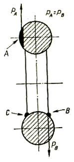 При статическом уравновешивании стремятся к тому, чтобы колесо, установленное на исправных подшипниках, в любом положении оставалось неподвижным, что свидетельствует о равенстве масс, находящихся по обе стороны оси вращения. Для этого колесо закрепляют на валу, установленном на подшипниках или призмах. Затем добиваются с помощью противовесов (свинцовых грузиков) такого положения, чтобы колесо, повернутое в любое положение, оставалось неподвижным. При этом абсолютно безразлично, на какую сторону обода устанавливается противовес. Например, если избыточный вес помещается в точке Л (рисунок 12), то для выполнения условия статического равновесия противовес может быть установлен в точке В или С. Противовес, установленный в точке В, уравновешивает систему. Однако при вращении колеса наличие избыточных масс, расположенных в точках А и В, влечет за собой возникновение центробежных сил, равных по величине, но действующих не по одной прямой. Это создает момент, вызывающий колебания управляемых колес. Таким образом, статическое уравновешивание колес позволяет установить лишь радиальное положение неуравновешенной массы. Определить осевое положение нельзя. Поэтому лишь случайно может увеличиться динамическая неуравновешенность при установке противовеса на наружную или внутреннюю сторону обода.