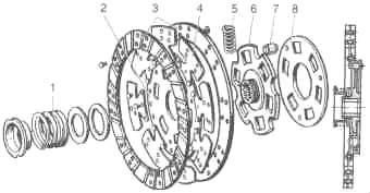 Ведений диск зчеплення (рисунок.5) виконано окремо від маточини 6, крутний момент на яку передається через демпферні пружини 5. Останні розміщено у вікнах маточини 6 і дисків 2 та 8, скріплених через вирізи в маточині пальцями 7. До диска 2 прикріплено хвилясті пружинні пластини 4 з двома фрикційними накладками 3. Після вмикання зчеплення хвилясті пружини розпрямляються поступово. Забезпечуючи більш плавне вмикання. Ведений диск має також гаситель крутильних коливань, виконаний у вигляді пружини 1, яка притискає диск 2 до маточини 6 із деяким зусиллям.