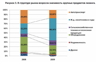 «Подушкой безопасности», не допустившей еще более глубокого проседания рынка по итогам года, стал сегмент лизинга авиации. Также в сравнении с прошлым годом выросли объемы лизинга подвижного состава и сельскохозяйственной техники. Автолизинг, как и автопром в целом, сократился двукратно. Заметное падение наблюдалось и в большинстве сегментов сделок с оборудованием за исключением телекоммуникационного и нефтегазового. Основной тенденцией 2009 года можно признать рост степени концентрации бизнеса вокруг крупнейших компаний, в большинстве своем имеющих отношение к государственному капиталу.