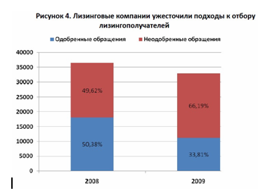 Совокупный портфель лизинговых компаний, принявших участие в исследовании, проведенном ассоциацией «Рослизинг», за 2009 год изменился незначительно, увеличившись на 1% и достигнув 457,9 млрд рублей. Число заключенных в прошедшем году контрактов сократилось в два раза и составило 29 333 штуки. Лизинговые компании значительно ужесточили процесс отбора лизингополучателей. На фоне сокращения числа обращений предприятий к лизинговым компаниям (на 9,5%) была одобрена лишь треть сделок (33,81%). В 2008 году контракты заключались в 50 случаях из 100. Топ-менеджмент лизинговых компаний называет поиск качественных заемщиков одной из наиболее серьезных задач, с которыми лизингодателям пришлось столкнуться в истекшем году. Она останется актуальной и в 2010 году.[19]