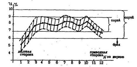 Средняя влажность газетной бумаги по ширине полотна (-) и вероятностные границы(---) её изменения