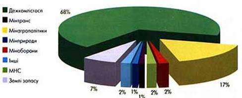 Рис.1. Розподіл загальної площі земель лісового фонду України за відомчою підпорядкованістю, %